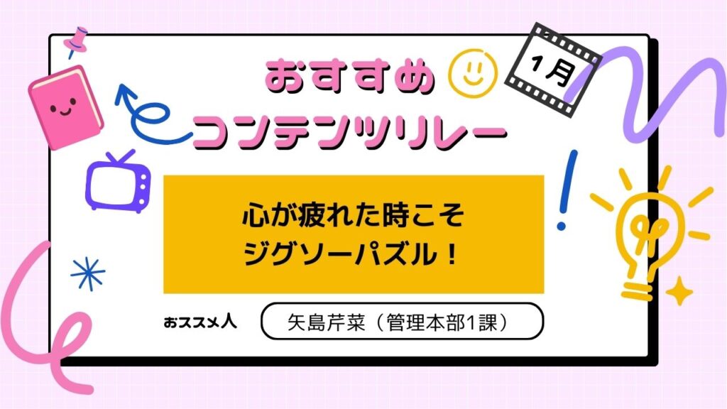 映画、ドラマ、本、旅先、動画…。 仕事の合間に支えてくれたもの、元気をもらったコンテンツをバトン形式で紹介していくコーナーです。 今回のおススメ人 矢島芹菜(管理本部1課) 今回のおすすめコンテンツ 心が疲れた時こそ、ジグソーパズル 1000ピー... -