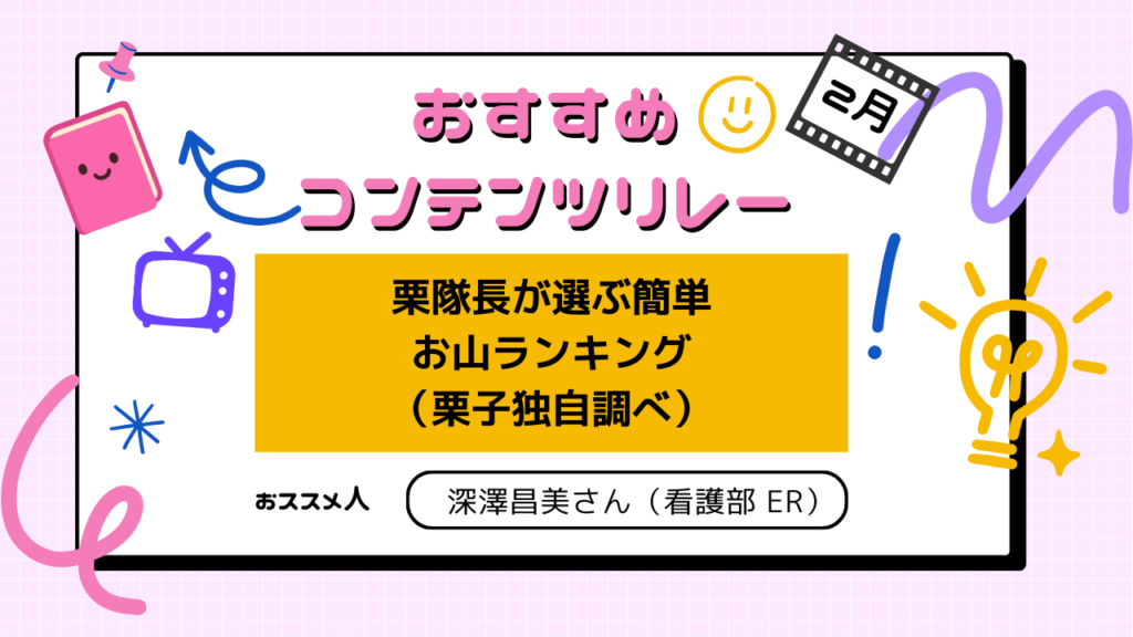 栗隊長が選ぶ簡単お山ランキング (栗子独自調べ) 映画、ドラマ、本、旅先、動画…。 仕事の合間に支えてくれたもの、元気をもらったコンテンツをバトン形式で紹介していくコーナーです。 今回のおススメ人 深澤昌美さん(看護部 ER) 1位 ... -