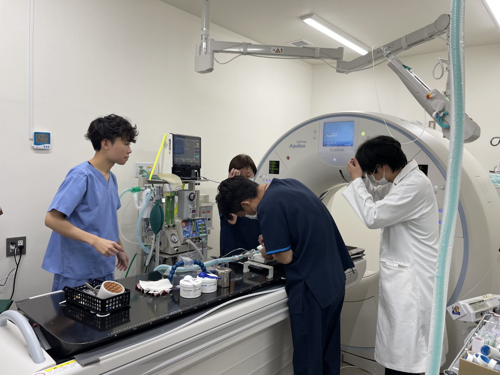 画像診断科では、他の診療科から依頼いただいた検査の撮影と読影・解析を行っています。撮影班と読影班に分かれていて、読影については私を含めた3名の獣医師が担当し、撮影については撮影スタッフが担当しています。画像検査には沢山の保定が必要にあるため、学生さん達がサポートしてくれており、スタッフは検査をしながら学生を教える経験が、学生は実際の臨床を学ぶことができ、どちらにとってもプラスになっています。