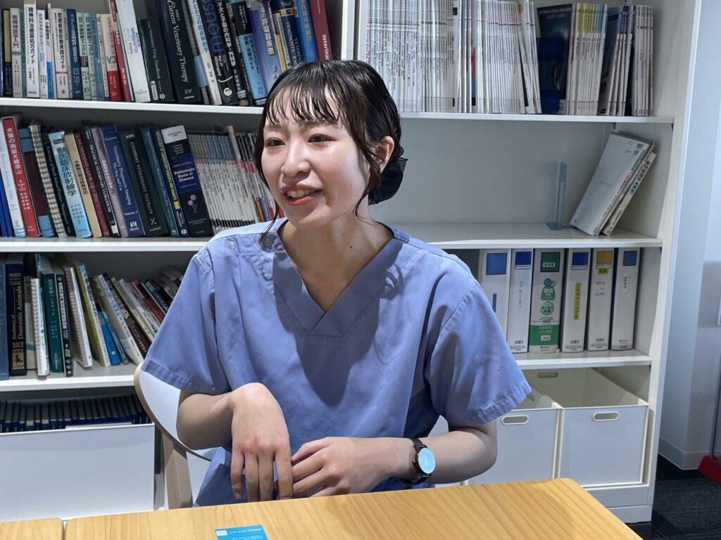 高校生くらいから動物看護師を目指すようになったのですが、以前愛犬がかかったこともありこの病院のことは知っていましたし、こういう大きな二次病院で働きたいな…とも思っていました。そんななか大学の実習でこちらに来たときに、看護師さん主導でいろいろなことが進んでいく光景や、先生たちと対等に意見を出し合ったりしている先輩方の姿を目にし、とても感銘を受けたんです。その仕事ぶりはものすごく格好良くて、こういう動物看護師になりたい!と初めて明確に思えた瞬間でした。子供の頃に愛犬を助けてくれた憧れのこの病院で実際に働くことができているのが少し不思議でもありますが、夢が叶った!と感じています。